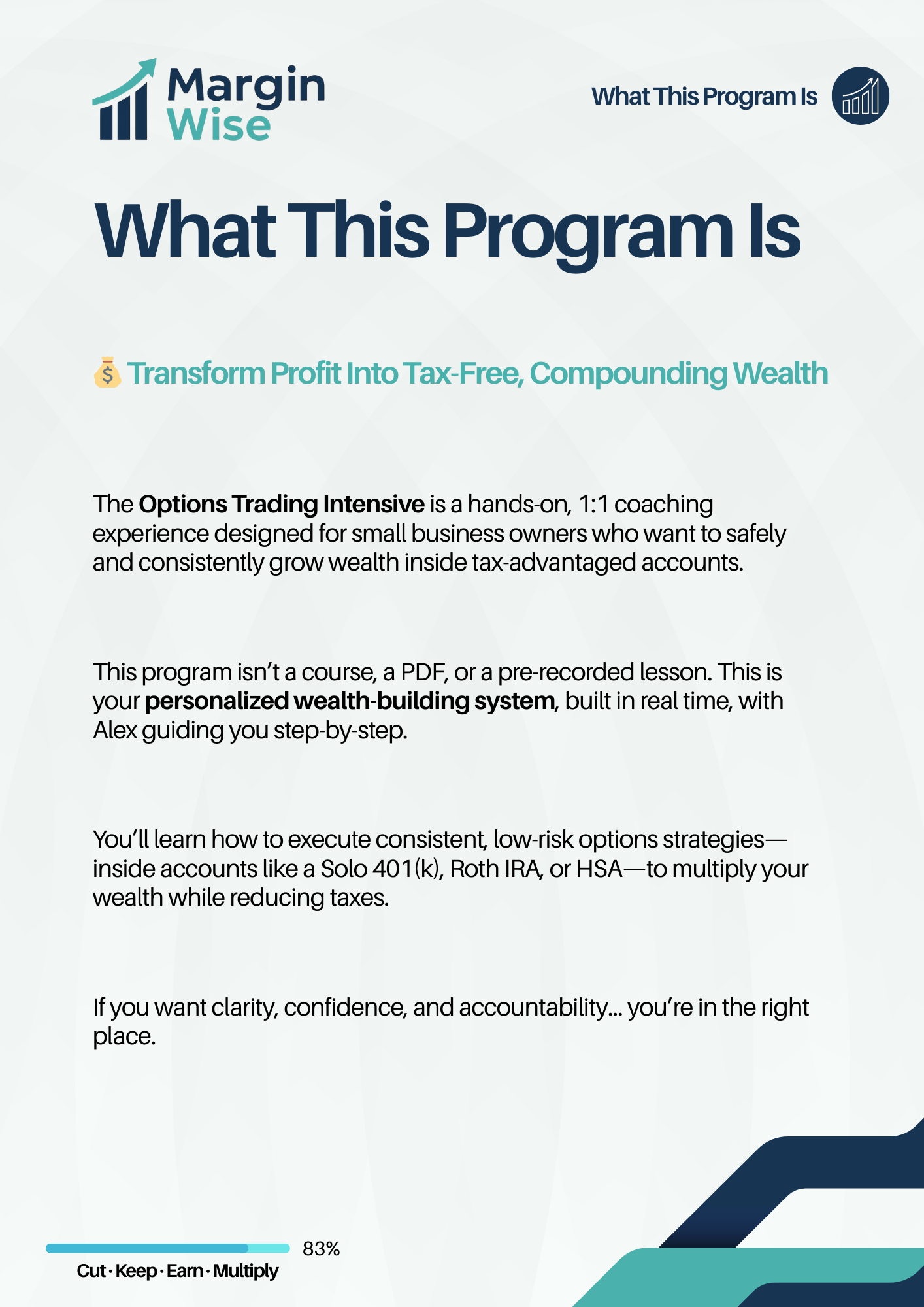 The MarginWise Options Trading Intensive is a personalized, hands-on coaching program for entrepreneurs who want to master safe, strategic options trading inside tax-advantaged accounts like Solo 401(k)s, Roth IRAs, and HSAs.