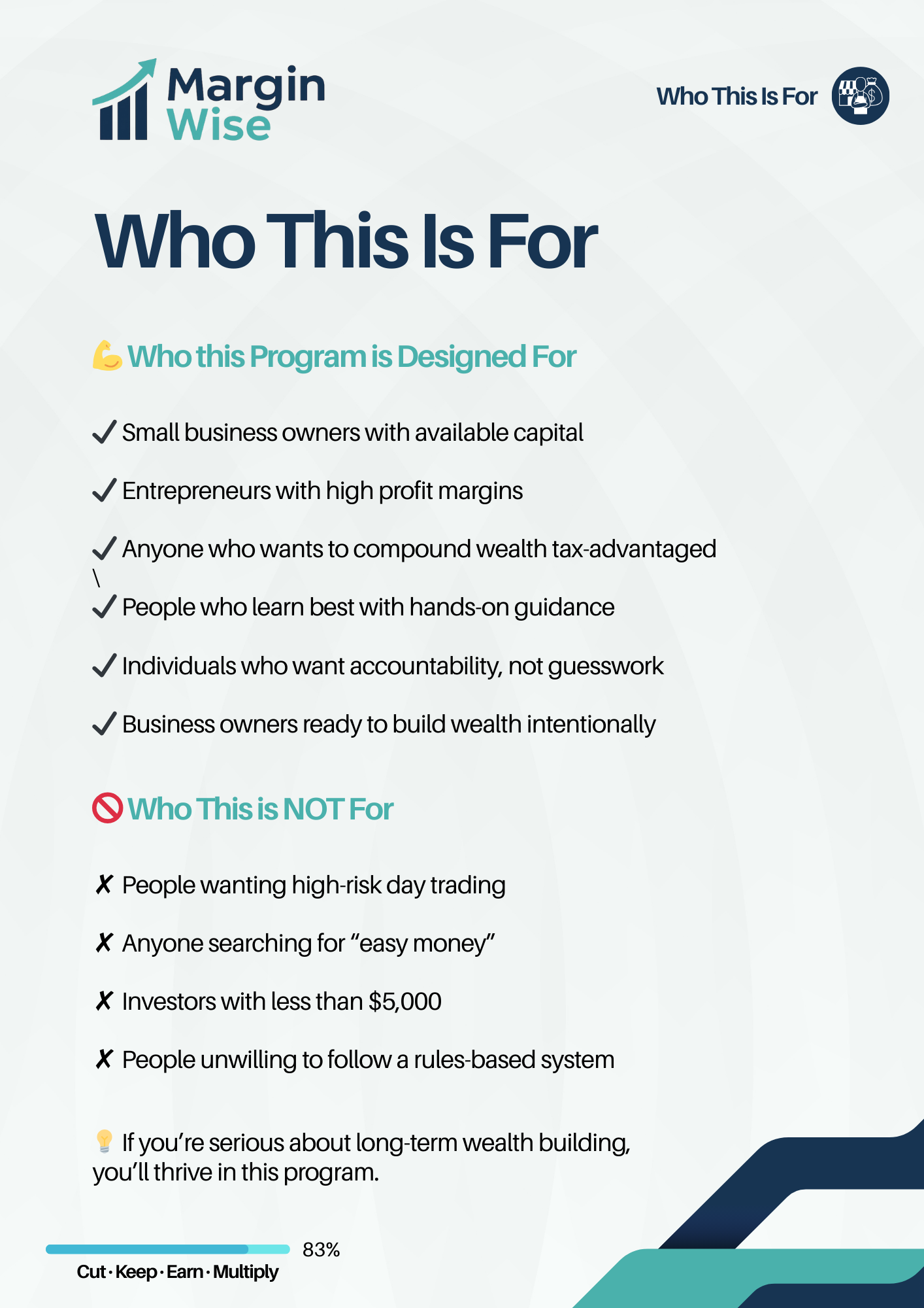 This high-touch program is built for small business owners with available capital who want direct guidance, accountability, and a long-term wealth plan built around their financial goals.