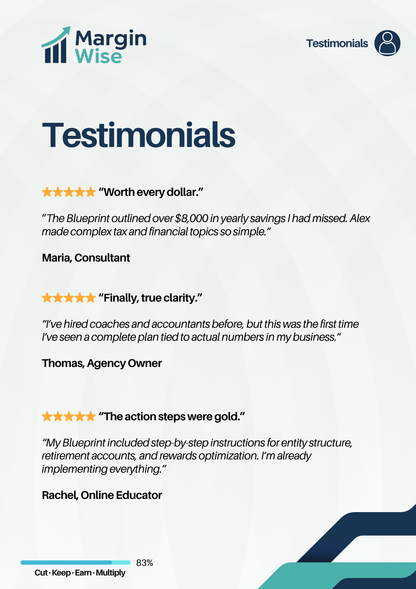 - 🧾 Detailed analysis of your business structure, expenses, and tax strategy