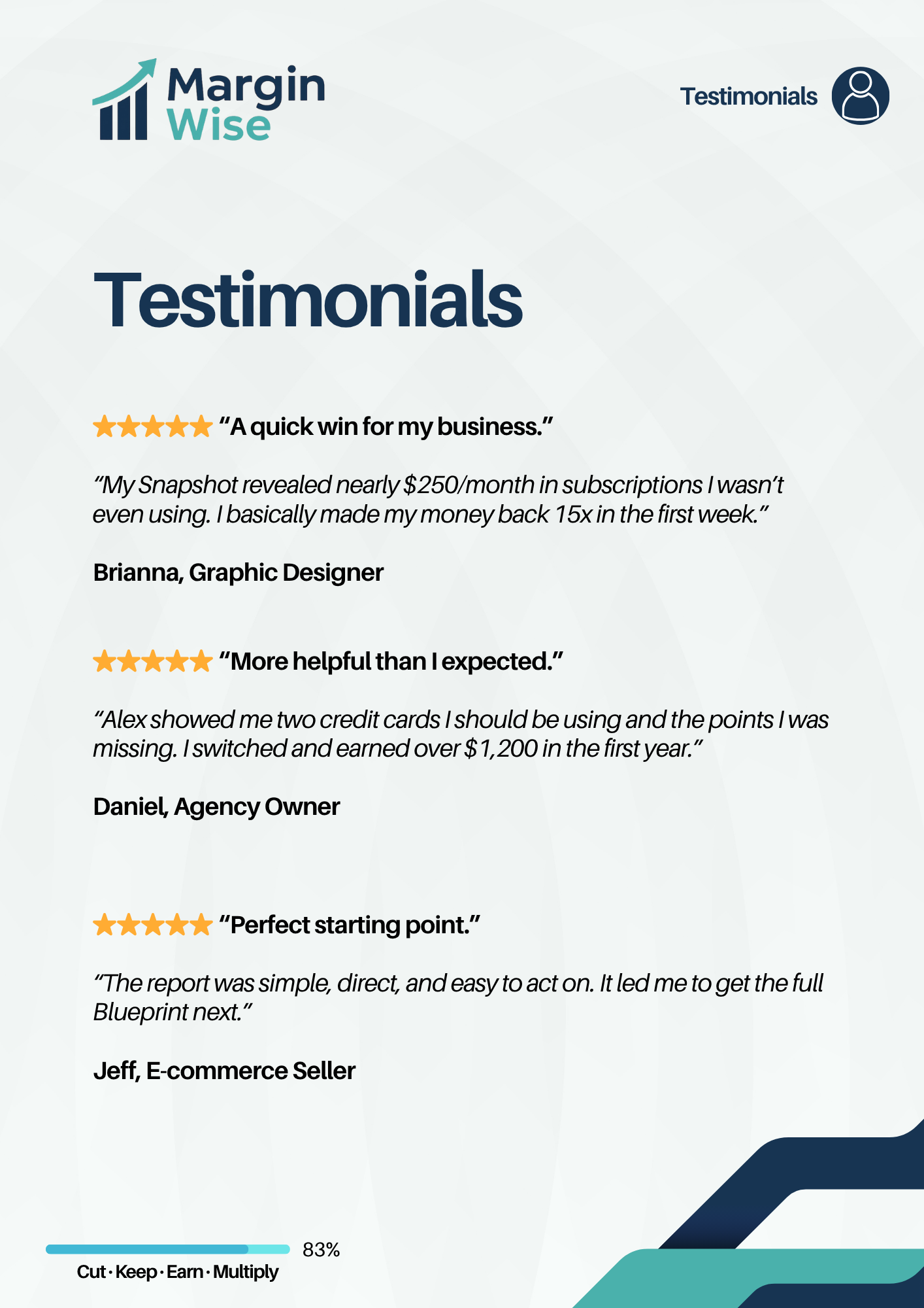The Profit Snapshot is a quick, actionable financial assessment designed for small business owners who want to increase profit without the guesswork. In just a few days, you’ll receive a customized report showing exactly where you can cut costs, improve cash flow, and boost profitability.